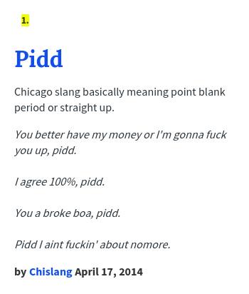 Urban Dictionary On Twitter Ogbryce Pidd Chicago Slang Basically Meaning Point Blank Period Or Straight Up Http T Co Ytmcqq0pi7 Http T Co N1ylahur7k